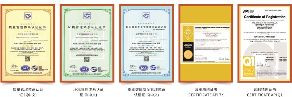 公司拥有一套完善的质量管理体系,通过了 ISO/9001 质量管理体系、ISO14001环境管理体系 、ISO45001 职业健康安全管理体系认证,取得了美国石油协会API 7K和API Q1产品体系认证。